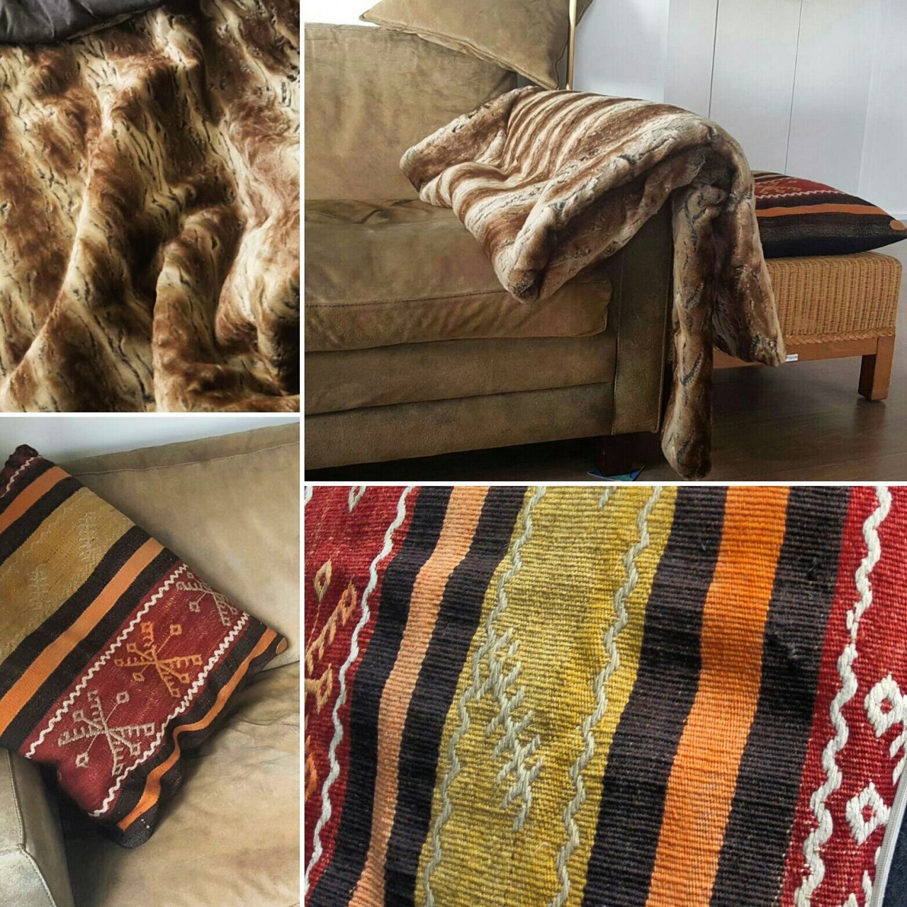 Op maat gemaakt plaid van imitatiebont en kelim woonkussen.